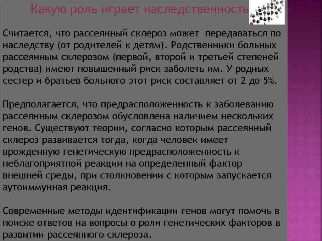 Какую роль играет наследственность?Считается, что рассеянный склероз может передаваться по