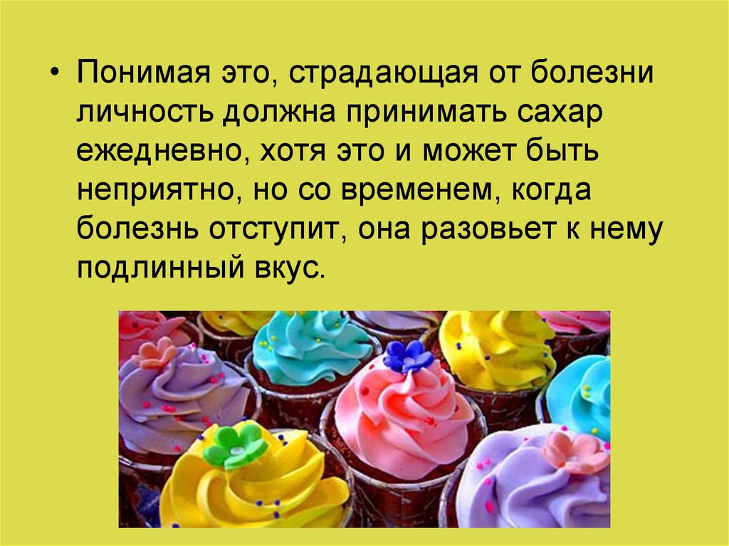 • Понимая это, страдающая от болезниличность должна принимать сахар
