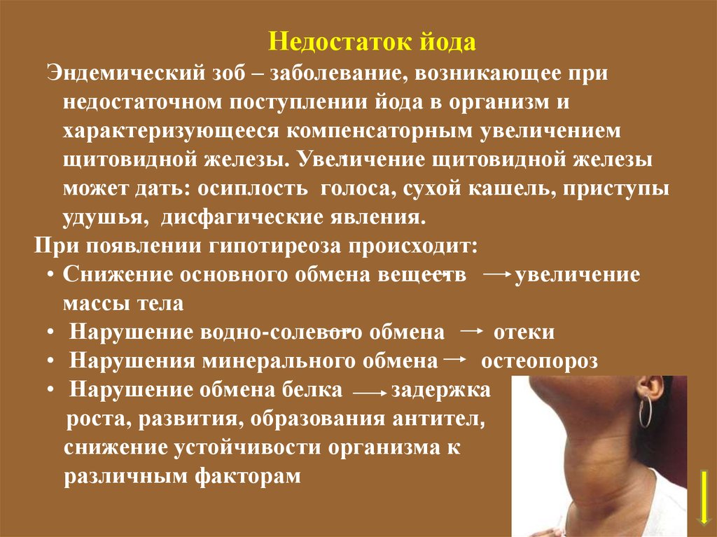 заболевания: эндемический зоб (нехватка