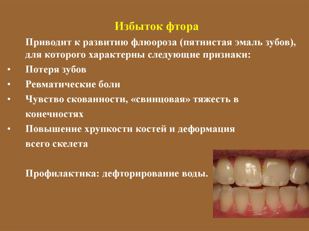 Избыток фтораПриводит к развитию флюороза (пятнистая эмаль зубов),
