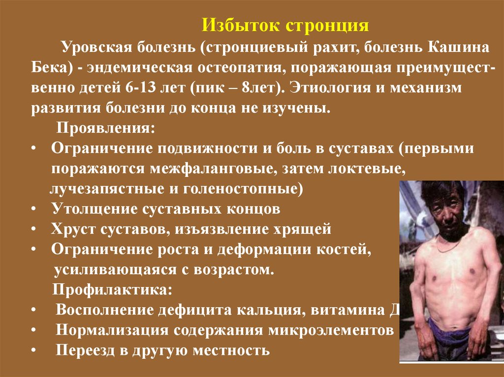 Избыток стронцияУровская болезнь (стронциевый рахит, болезнь Кашина