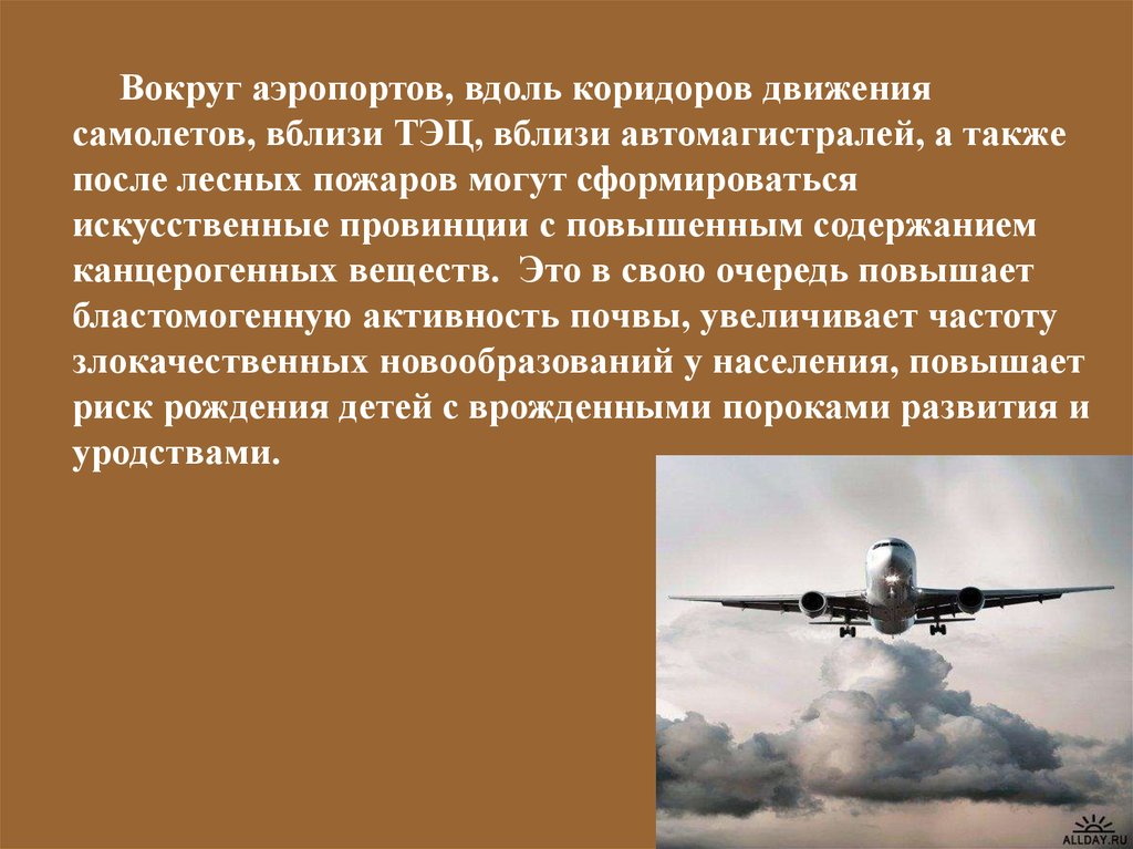 Вокруг аэропортов, вдоль коридоров движениясамолетов, вблизи ТЭЦ, вблизи автомагистралей, а также
