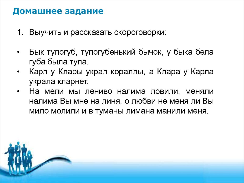 Домашнее задание1. Выучить и рассказать скороговорки: