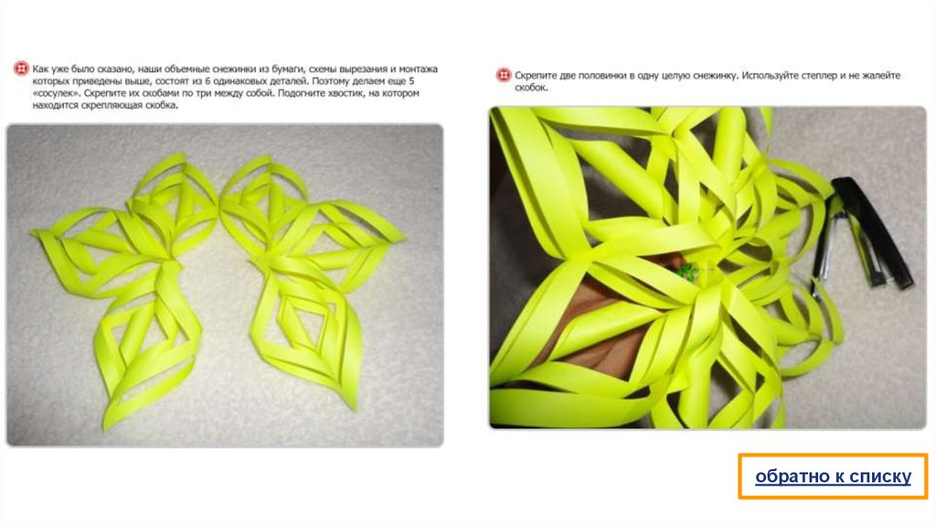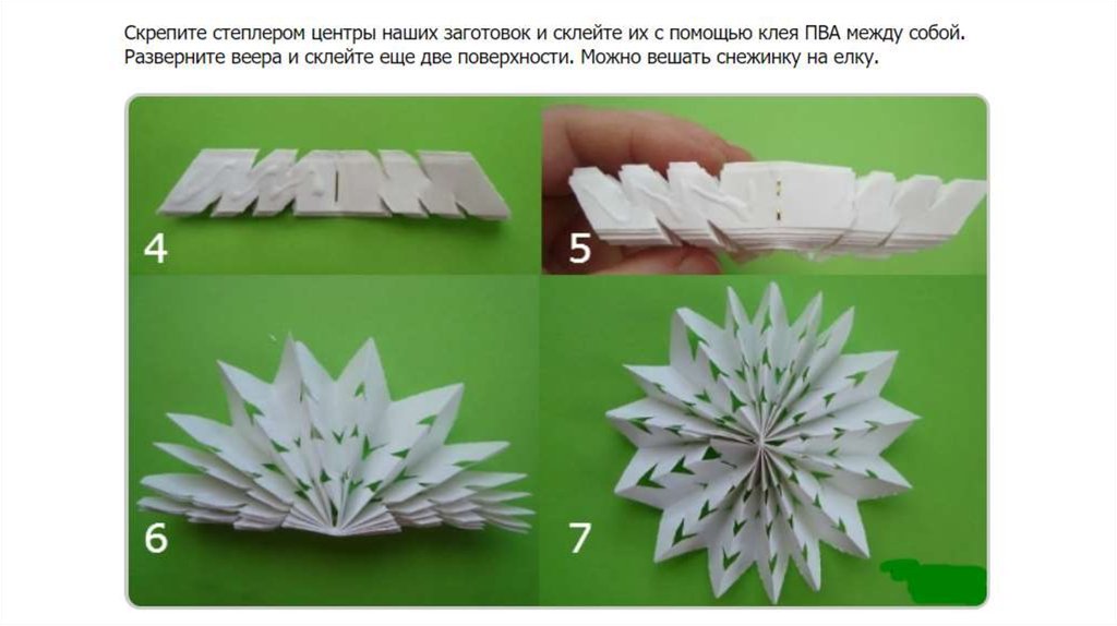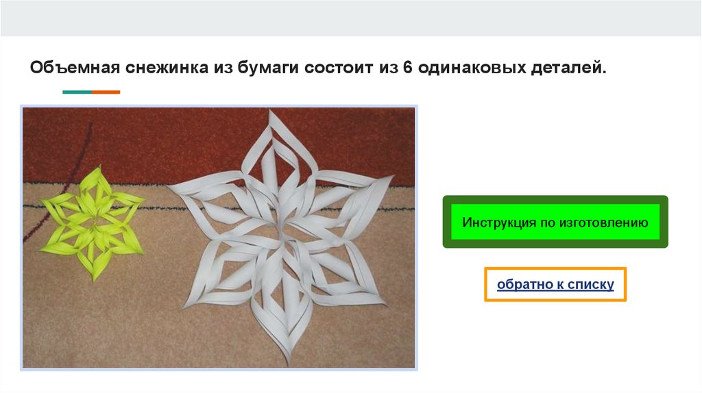 Объемная снежинка из бумаги состоит из 6 одинаковых деталей.Инструкция по изготовлению