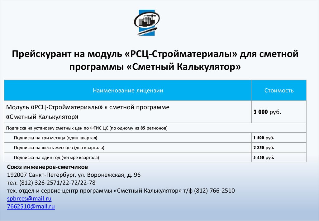 Прейскурант на модуль «РСЦ-Стройматериалы» для сметнойпрограммы «Сметный Калькулятор»