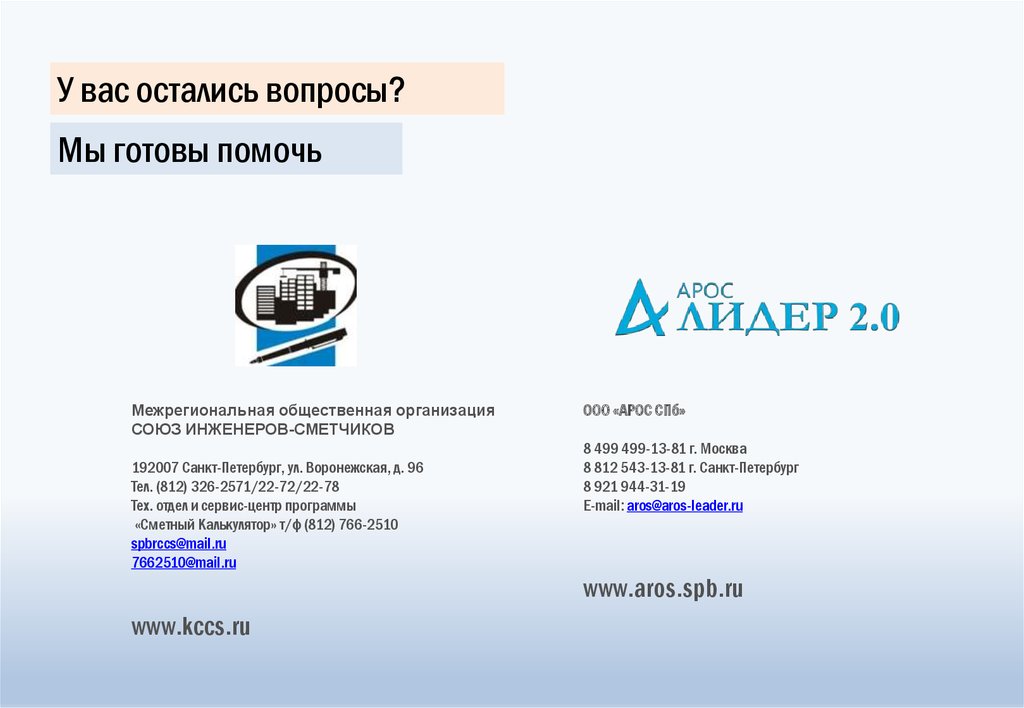 тех. отдел и сервис-центр программы «Сметный Калькулятор» т/ф (812) 766-2510