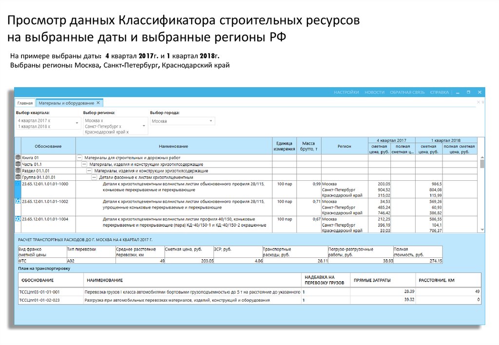 Просмотр данных Классификатора строительных ресурсовна выбранные даты и выбранные регионы РФ