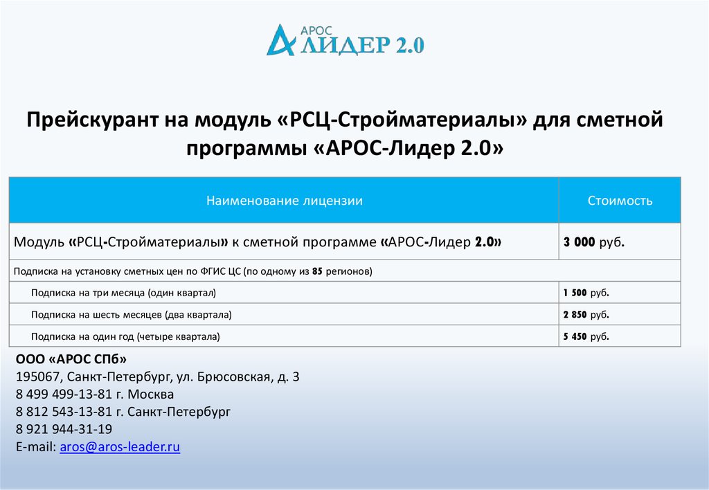 Прейскурант на модуль «РСЦ-Стройматериалы» для сметнойпрограммы «АРОС-Лидер 2.0»