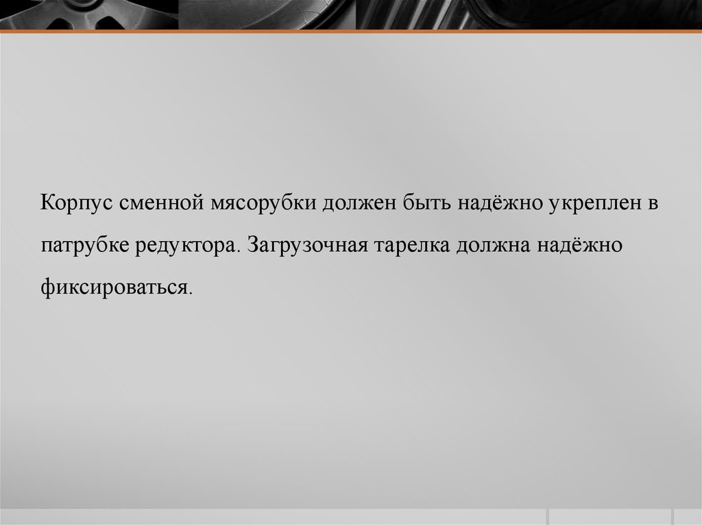Корпус сменной мясорубки должен быть надёжно укреплен впатрубке редуктора. Загрузочная тарелка должна надёжно