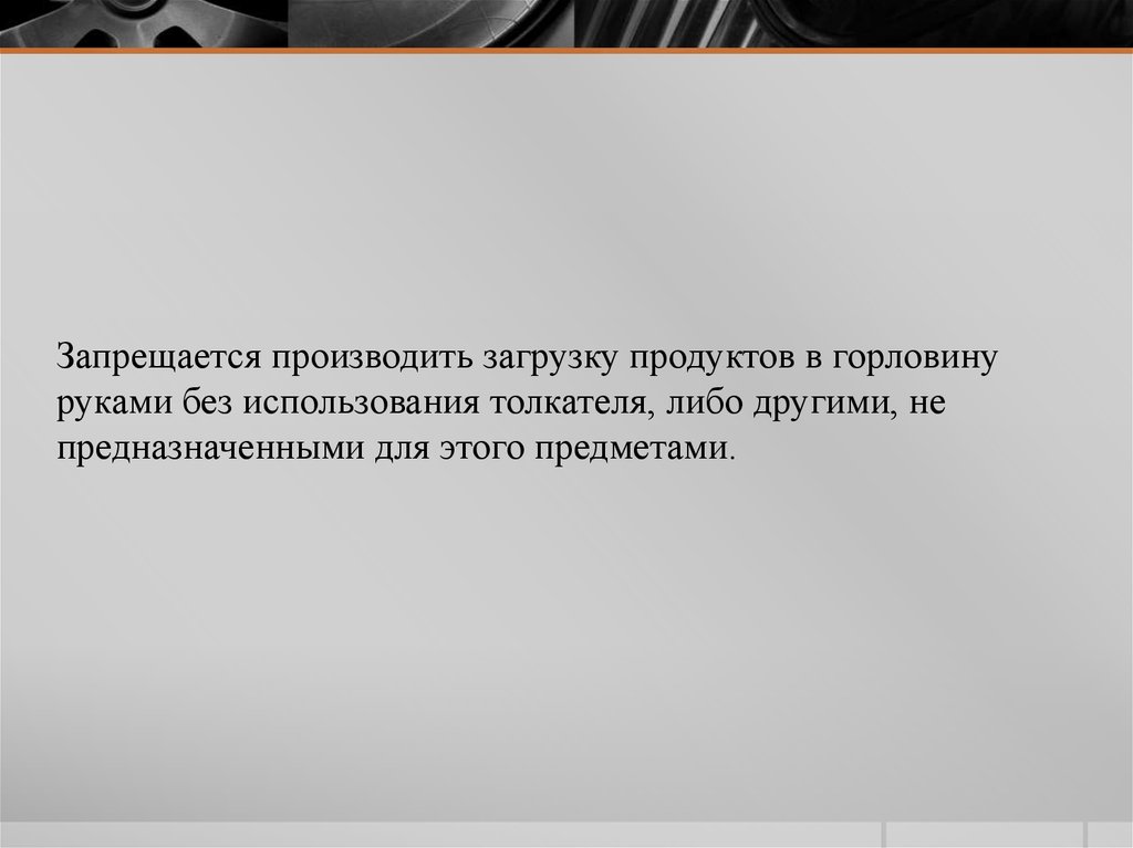 Запрещается производить загрузку продуктов в горловинуруками без использования толкателя, либо другими, не