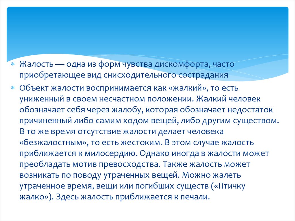 Жалость — одна из форм чувства дискомфорта, частоприобретающее вид снисходительного сострадания