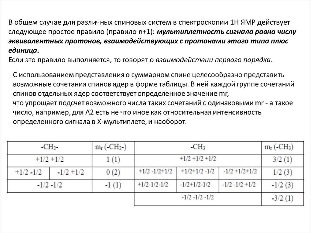 В общем случае для различных спиновых систем в спектроскопии 1Н ЯМР действуетследующее простое правило (правило n+1): мультиплетность сигнала равна числу