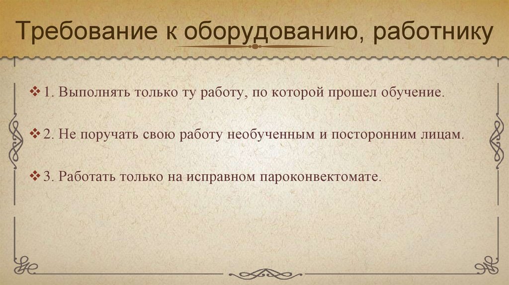 Требование к оборудованию, работнику1. Выполнять только ту работу, по которой прошел обучение.