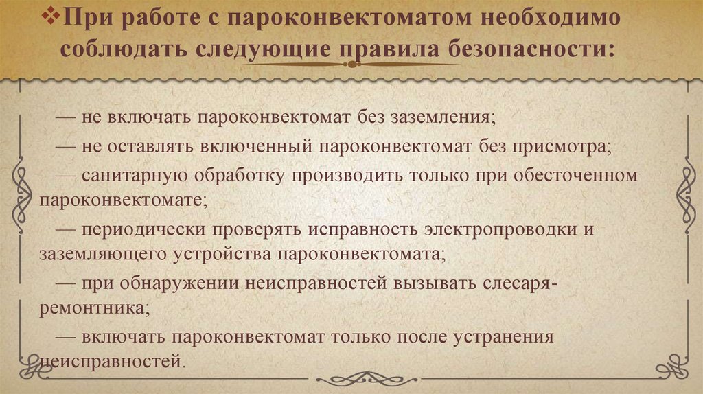 При работе с пароконвектоматом необходимособлюдать следующие правила безопасности: