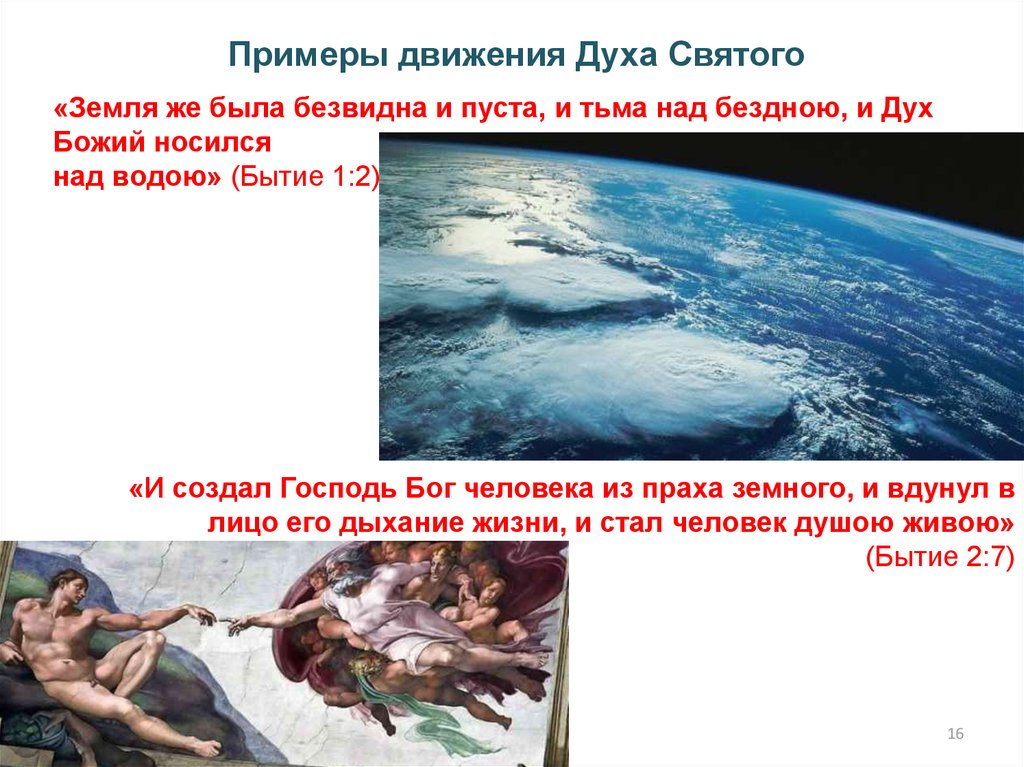 Примеры движения Духа Святого«Земля же была безвидна и пуста, и тьма над бездною, и Дух