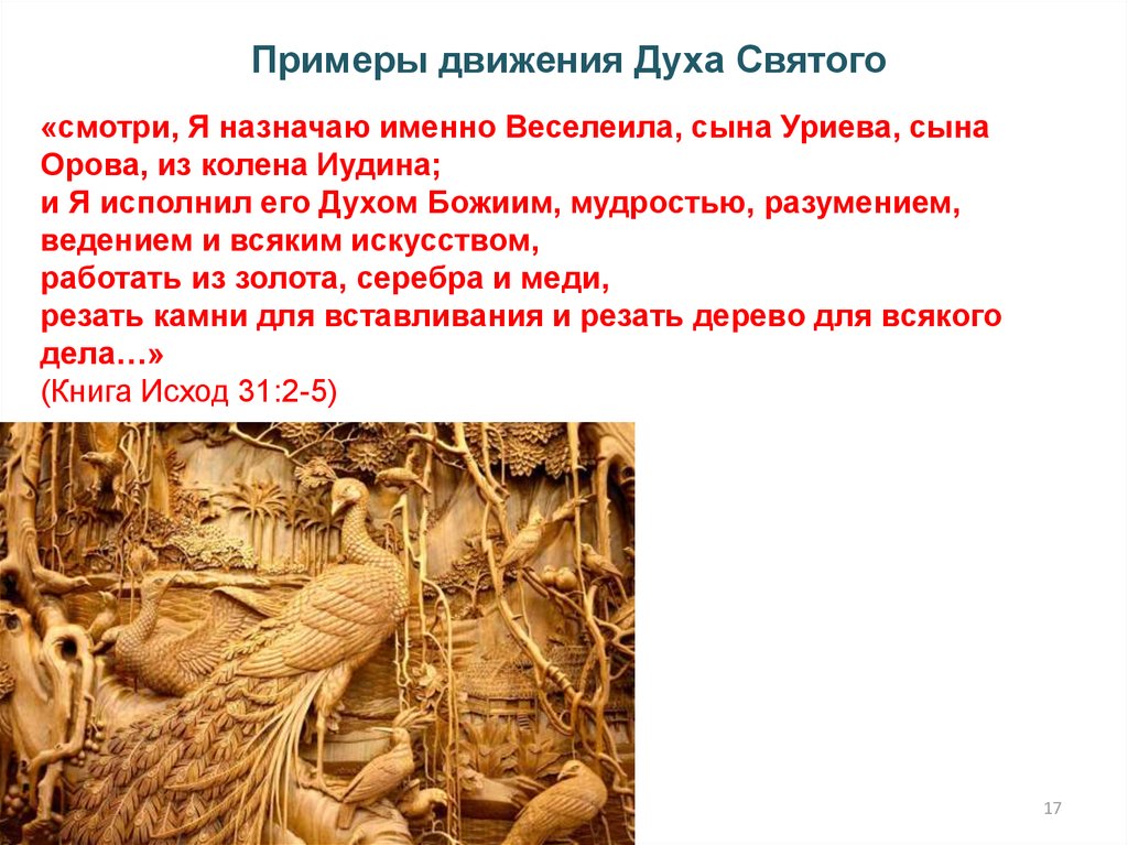 Примеры движения Духа Святого«смотри, Я назначаю именно Веселеила, сына Уриева, сына