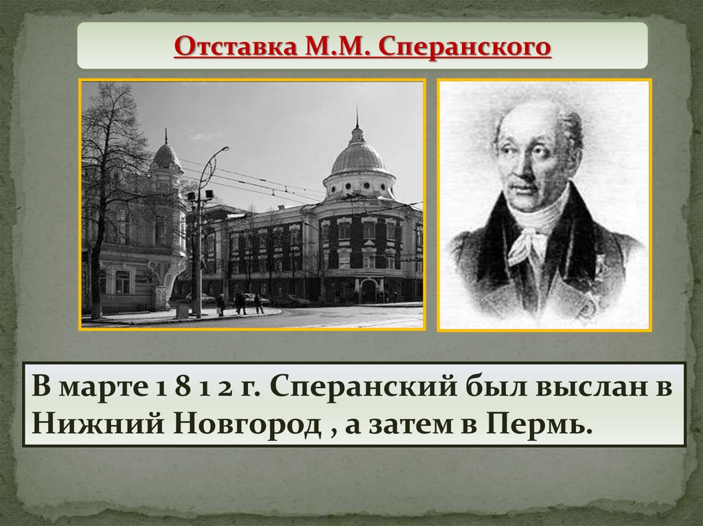 Отставка М.М. СперанскогоВ марте 1 8 1 2 г. Сперанский был выслан в