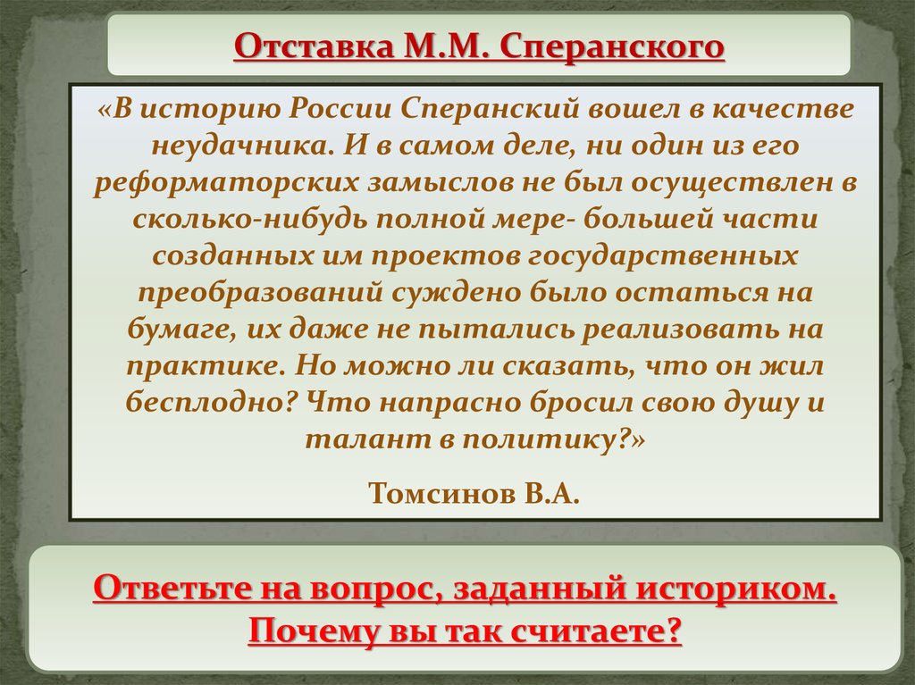 Отставка М.М. Сперанского«В историю России Сперанский вошел в качестве