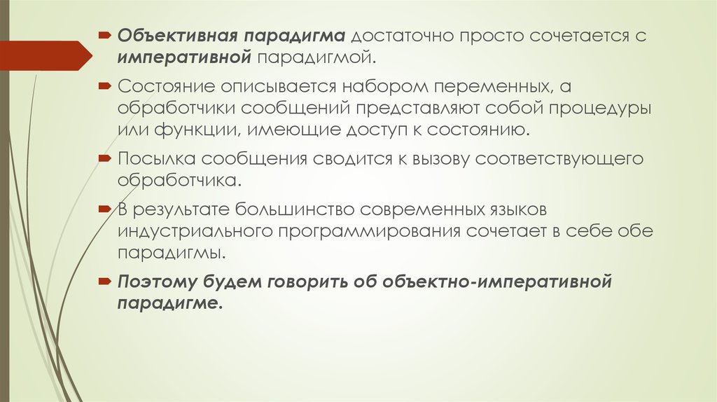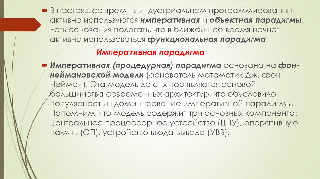 В настоящее время в индустриальном программированииактивно используются императивная и объектная парадигмы.
