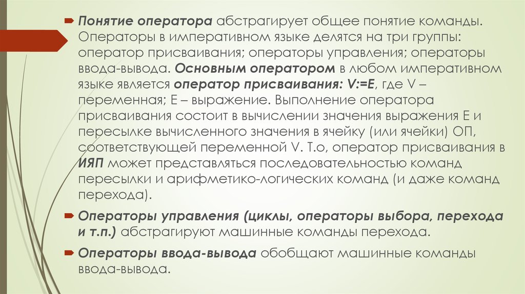 Понятие оператора абстрагирует общее понятие команды.Операторы в императивном языке делятся на три группы: