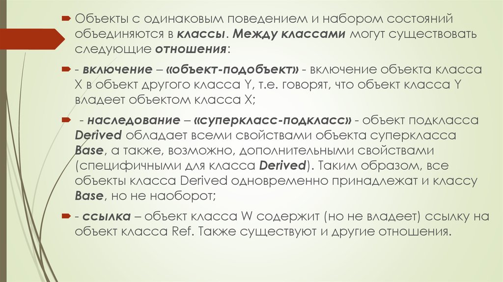 Объекты с одинаковым поведением и набором состоянийобъединяются в классы. Между классами могут существовать