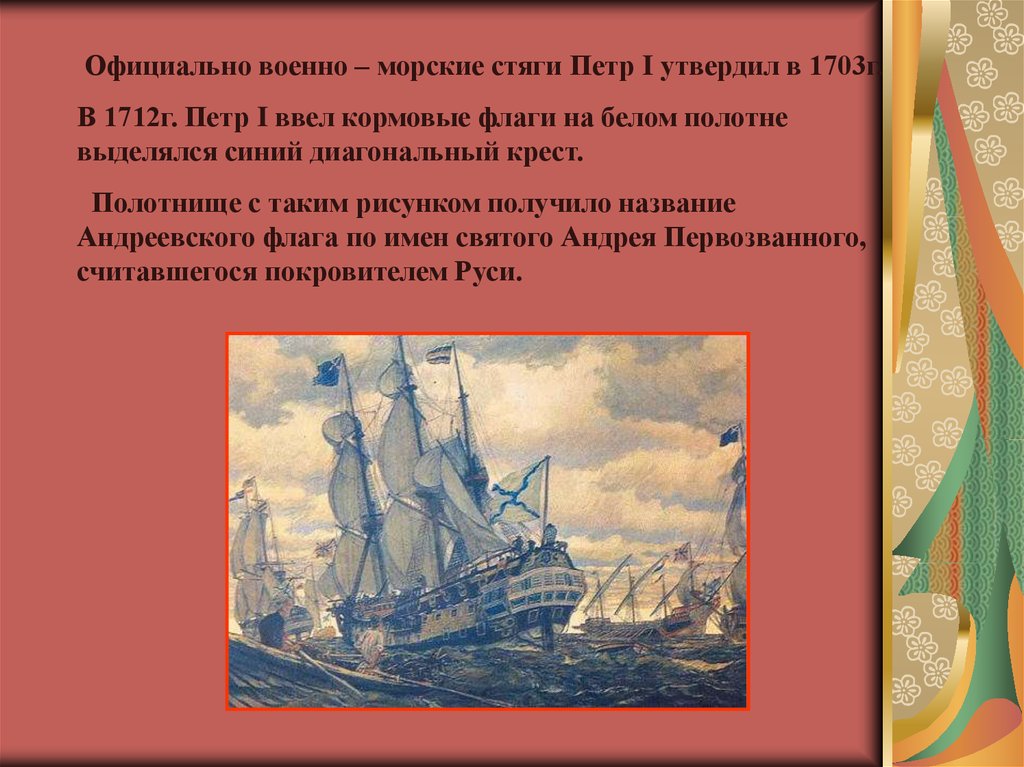 Официально военно – морские стяги Петр I утвердил в 1703г.В 1712г. Петр I ввел кормовые флаги на белом полотне