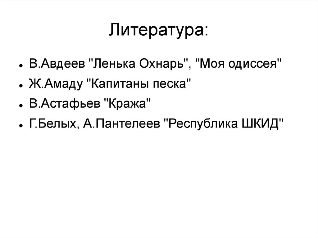 Литература:В.Авдеев "Ленька Охнарь", "Моя одиссея"