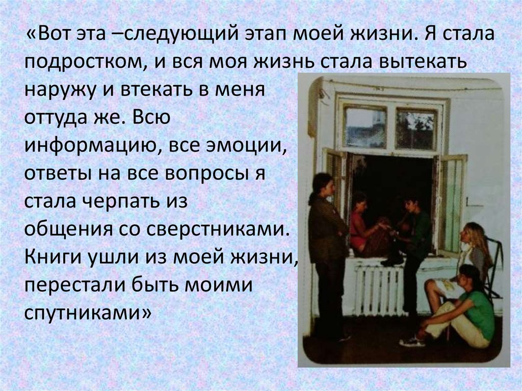 собеседниками. Я была застенчивой и не оченьто умела общаться со сверстниками. Я много