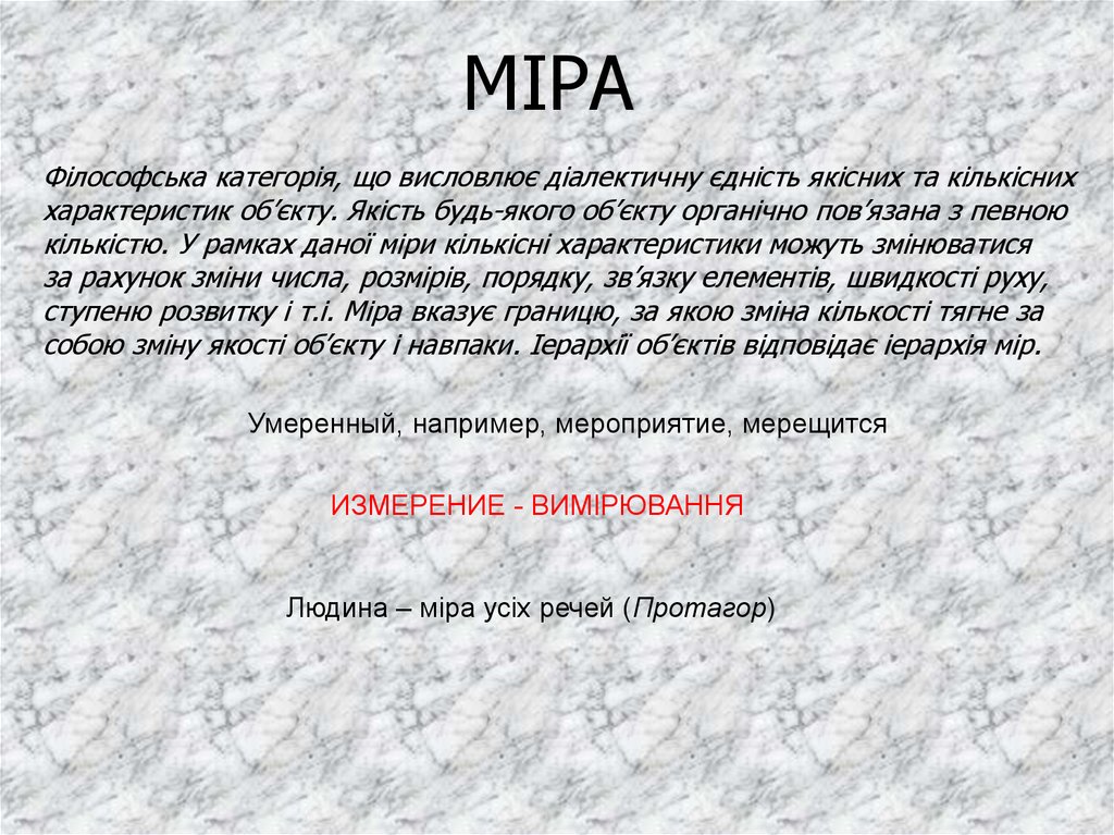 МІРАФілософська категорія, що висловлює діалектичну єдність якісних та кількісних