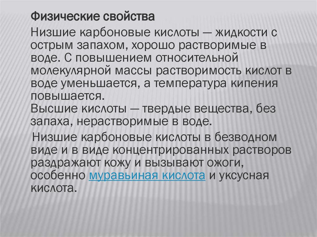 Физические свойстваНизшие карбоновые кислоты — жидкости с