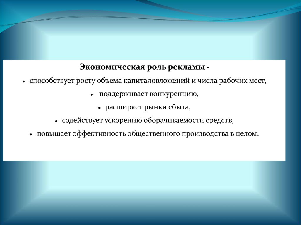 Экономическая роль рекламыспособствует росту объема капиталовложений и числа рабочих мест,