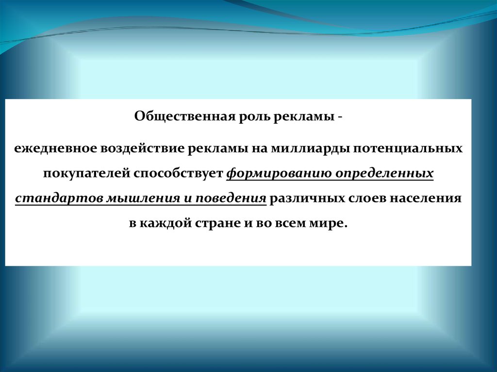 Общественная роль рекламы ежедневное воздействие рекламы на миллиарды потенциальныхпокупателей способствует формированию определенных
