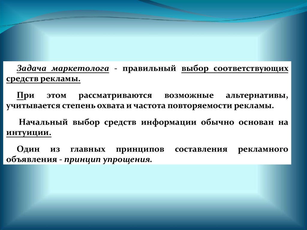 Задача маркетолога - правильный выбор соответствующихсредств рекламы.