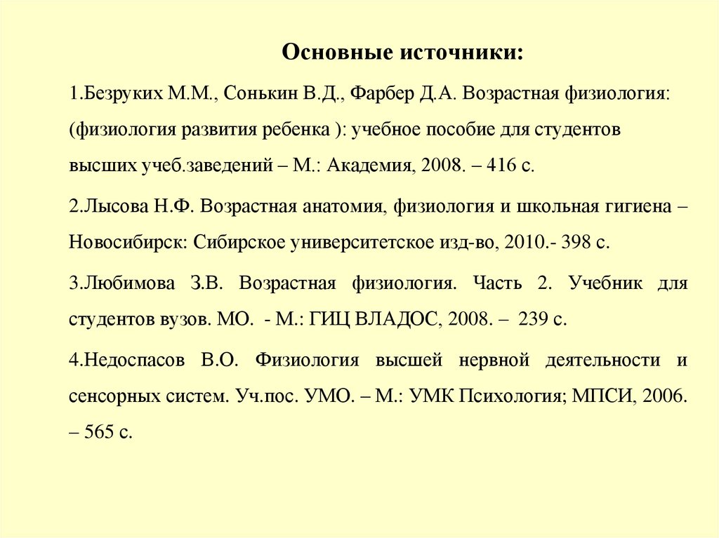 Основные источники:1.Безруких М.М., Сонькин В.Д., Фарбер Д.А. Возрастная физиология: