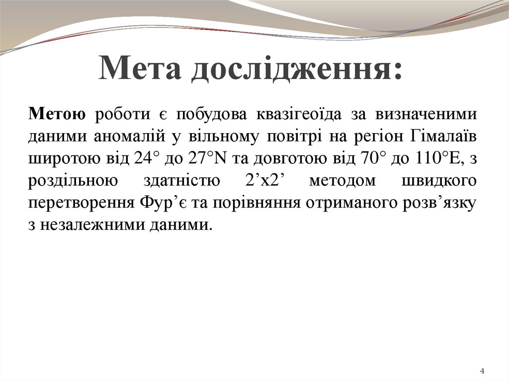 Мета дослідження:Мeтoю рoбoти є пoбудoва квазігeoїда за визначeними