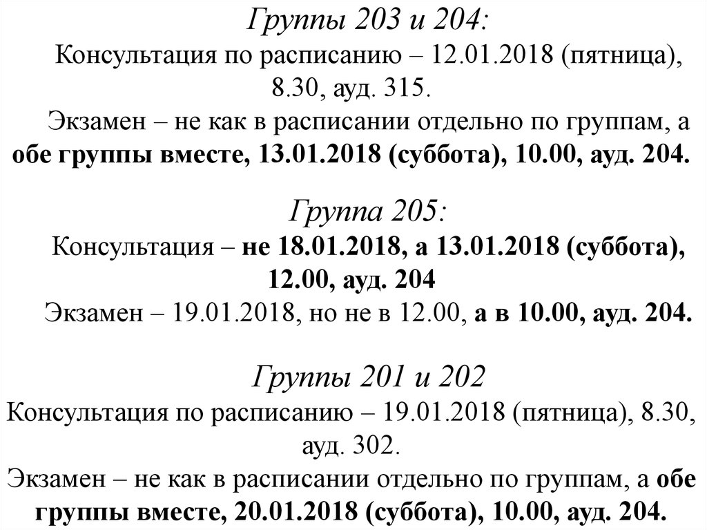 Группы 203 и 204:Консультация по расписанию – 12.01.2018 (пятница),