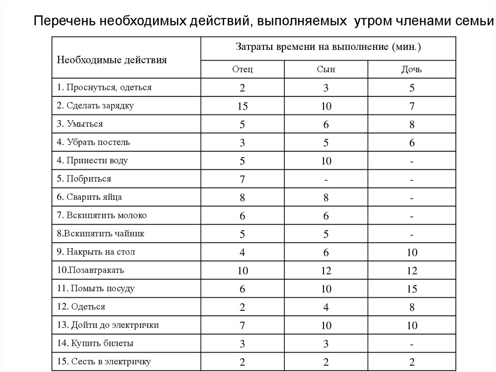 Перечень необходимых действий, выполняемых утром членами семьиЗатраты времени на выполнение (мин.)