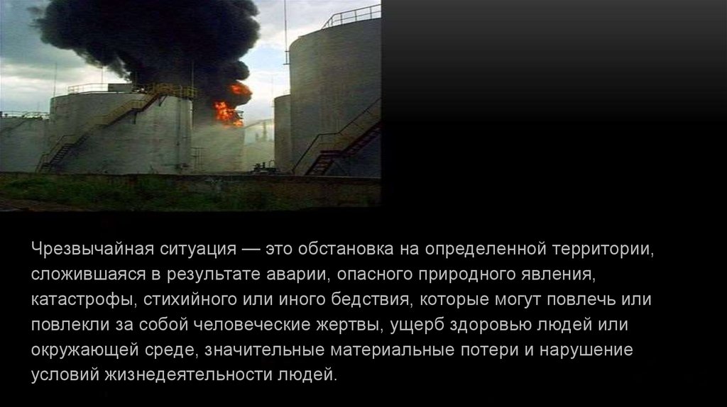 Чрезвычайная ситуация — это обстановка на определенной территории,сложившаяся в результате аварии, опасного природного явления,
