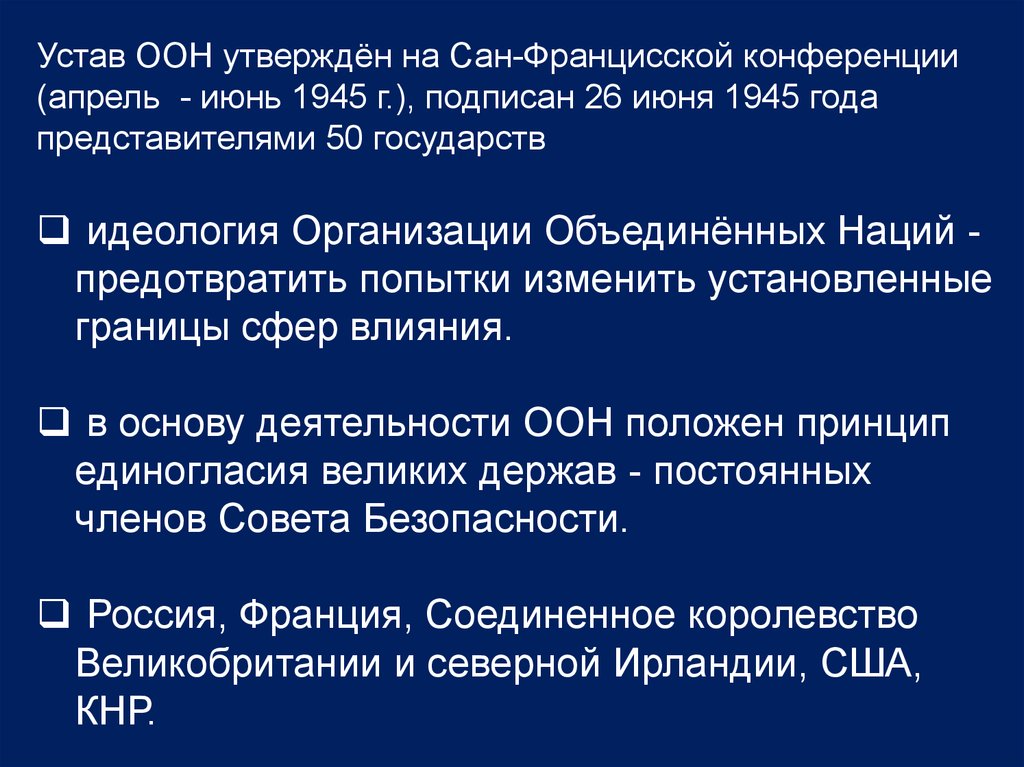 Устав ООН утверждён на Сан-Францисской конференции(апрель - июнь 1945 г.), подписан 26 июня 1945 года