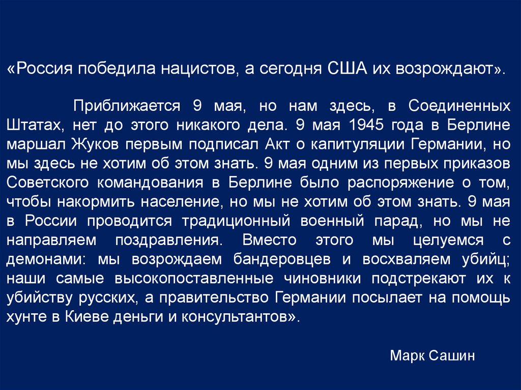 «Россия победила нацистов, а сегодня США их возрождают».Приближается 9 мая, но нам здесь, в Соединенных