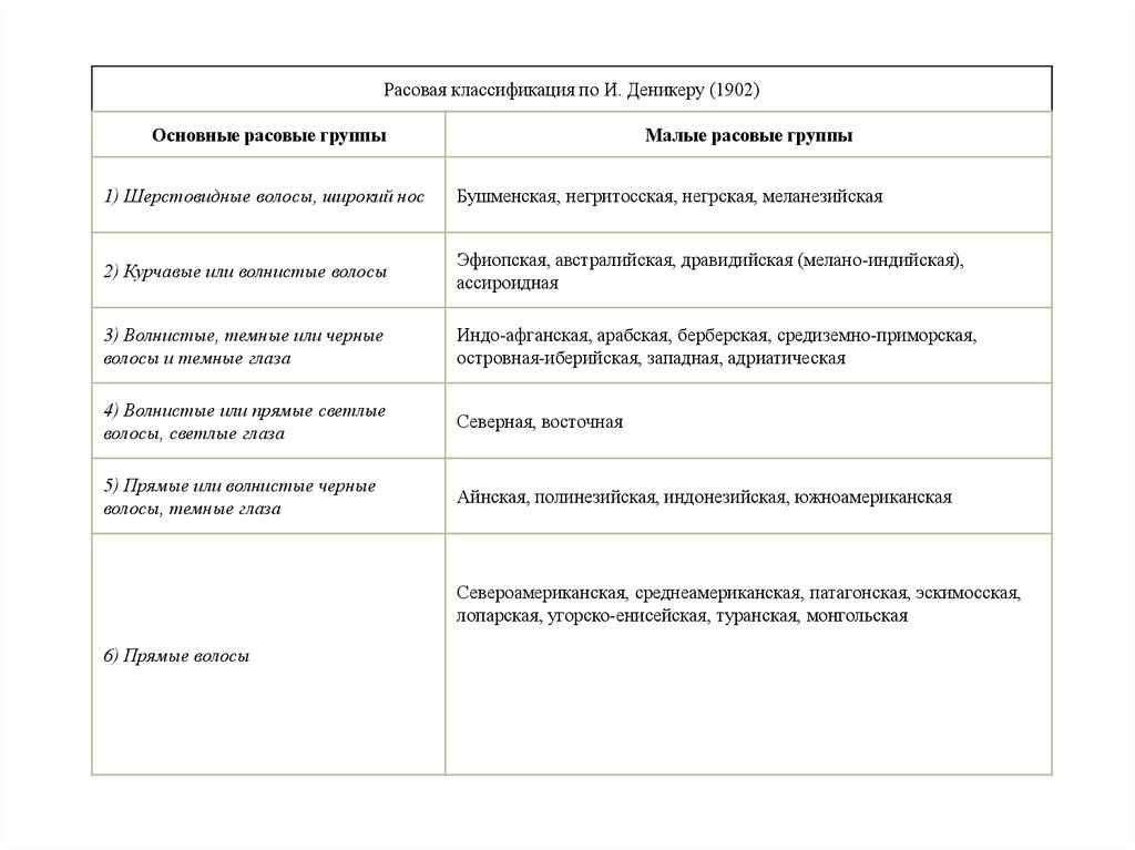 Расовая классификация по И. Деникеру (1902)Основные расовые группы