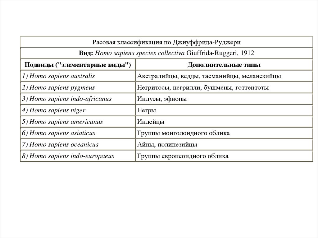Расовая классификация по Джиуффрида-РуджериВид: Homo sapiens species collectiva Giuffrida-Ruggeri, 1912