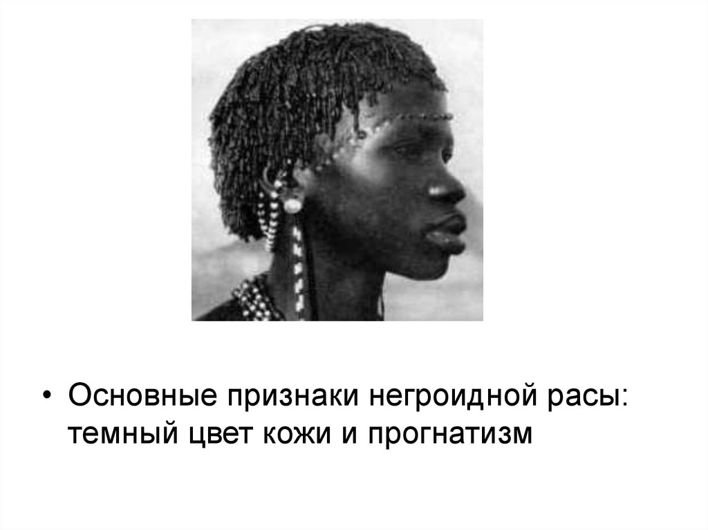 • Основные признаки негроидной расы:темный цвет кожи и прогнатизм