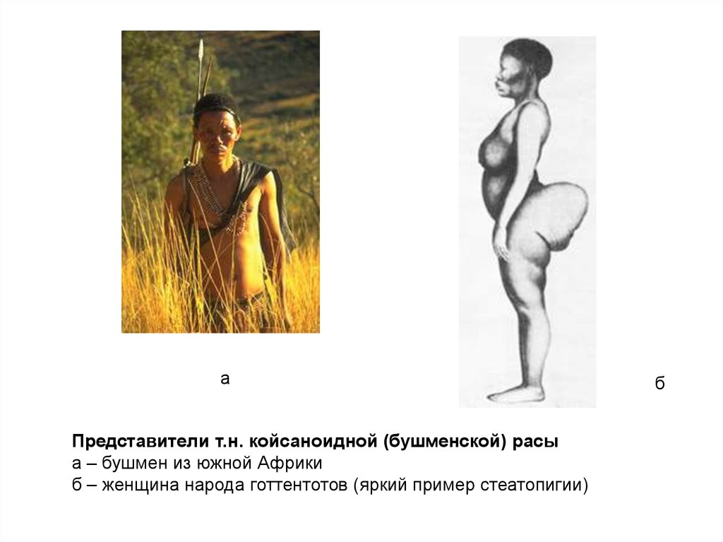 б – женщина народа готтентотов (яркий пример стеатопигии)