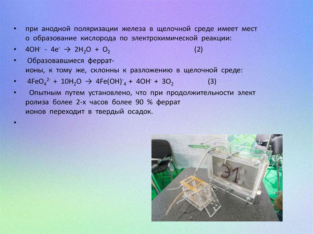 Образовавшиеся ферратионы, к тому же, склонны к разложению в щелочной среде: