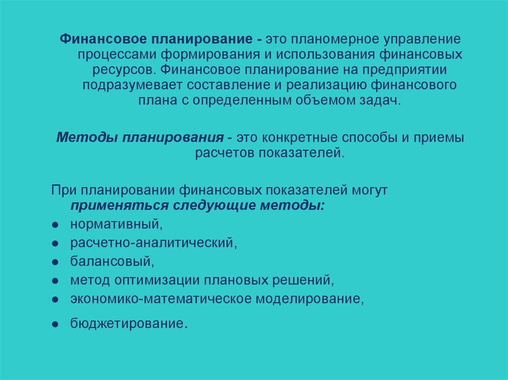 Финансовое планирование - это планомерное управлениепроцессами формирования и использования финансовых