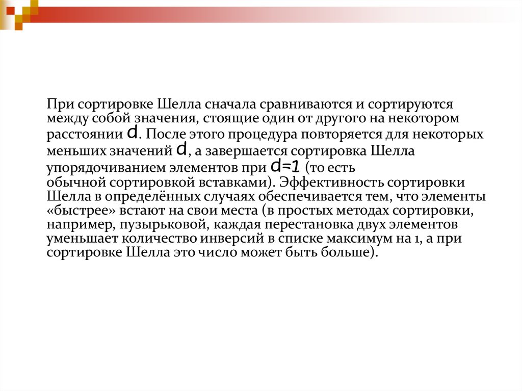 меньших значений d, а завершается сортировка Шелла