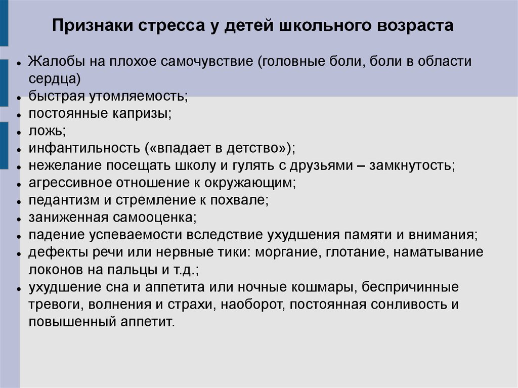 Признаки стресса у детей школьного возрастаЖалобы на плохое самочувствие (головные боли, боли в области