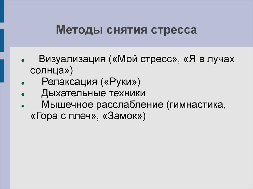 Методы снятия стрессаВизуализация («Мой стресс», «Я в лучах
