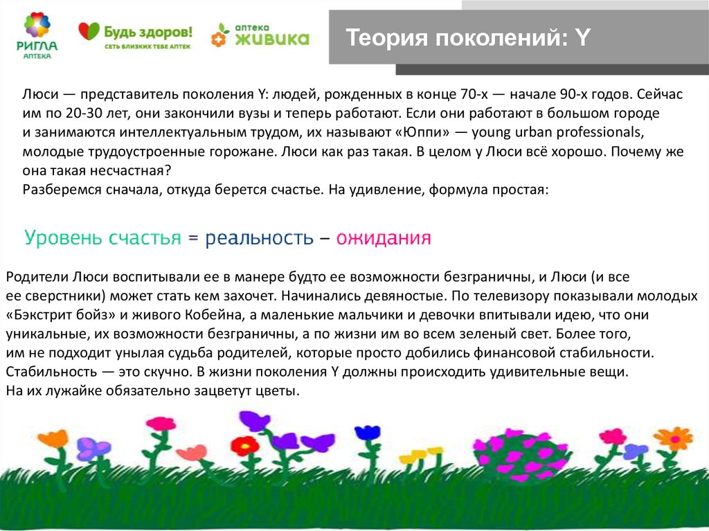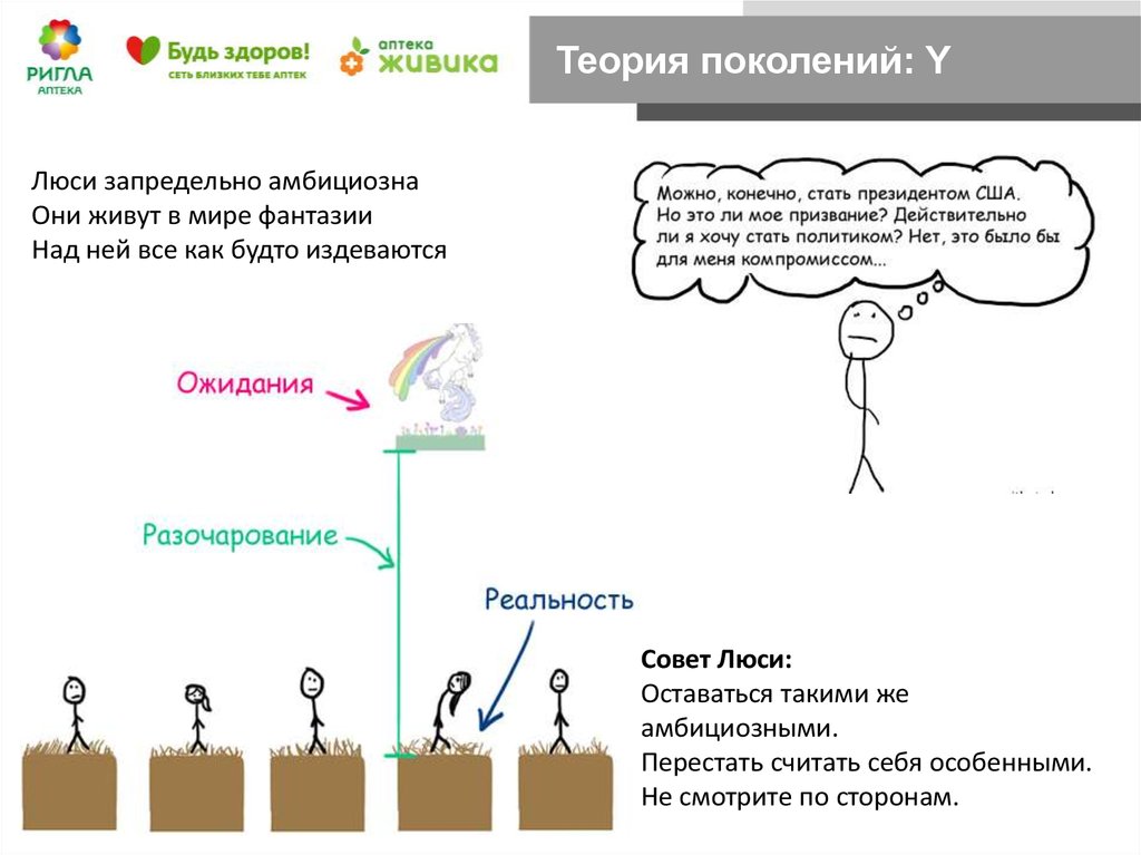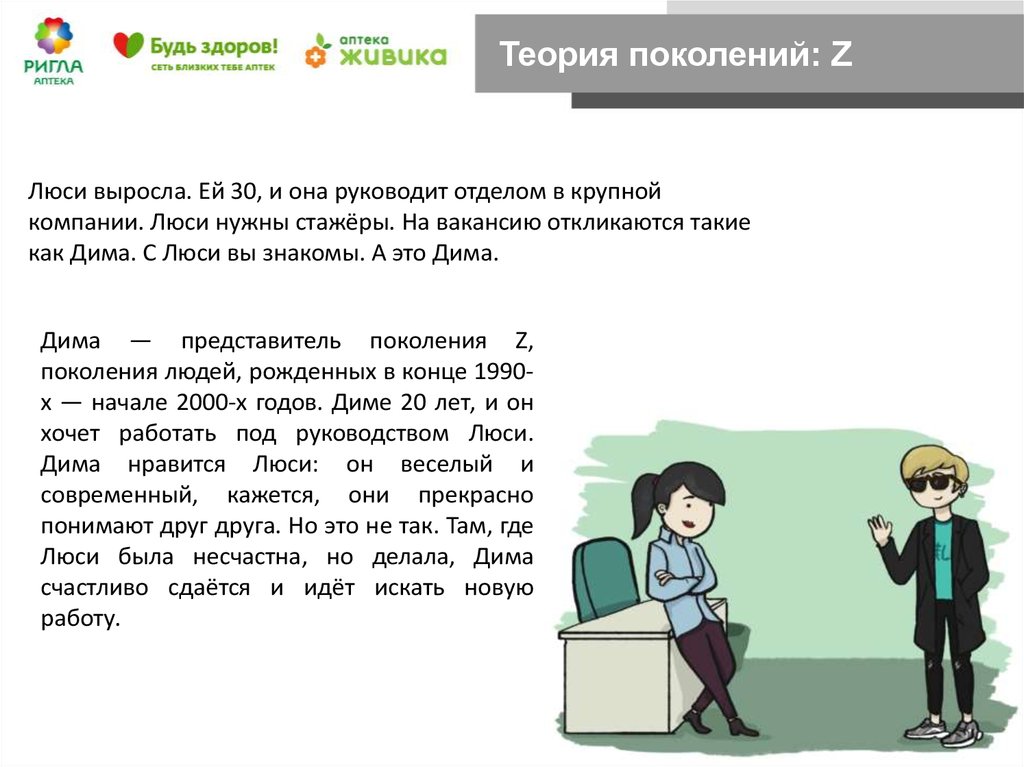 Теория поколений: YЛюси — представитель поколения Y: людей, рожденных в конце 70-х — начале 90-х годов. Сейчас